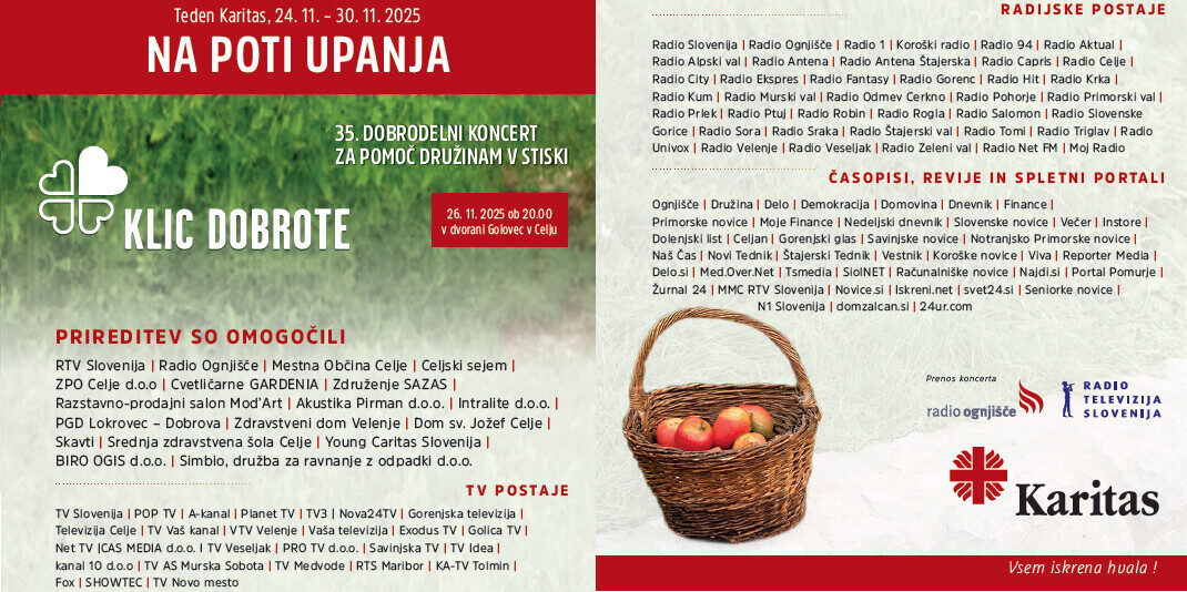 Slovenska karitas skupaj z RTV Slovenija prireja 35. tradicionalni dobrodelni koncert KLIC DOBROTE. Letošnje vodilo je: »Na poti upanja«. Številni nastopajoči glasbeniki in pevci tudi letos s svojim prostovoljnim nastopom nagovarjajo slovensko javnost, trkajo na dobroto src in prinašajo toplino v domove slovenskih družin v stiski.