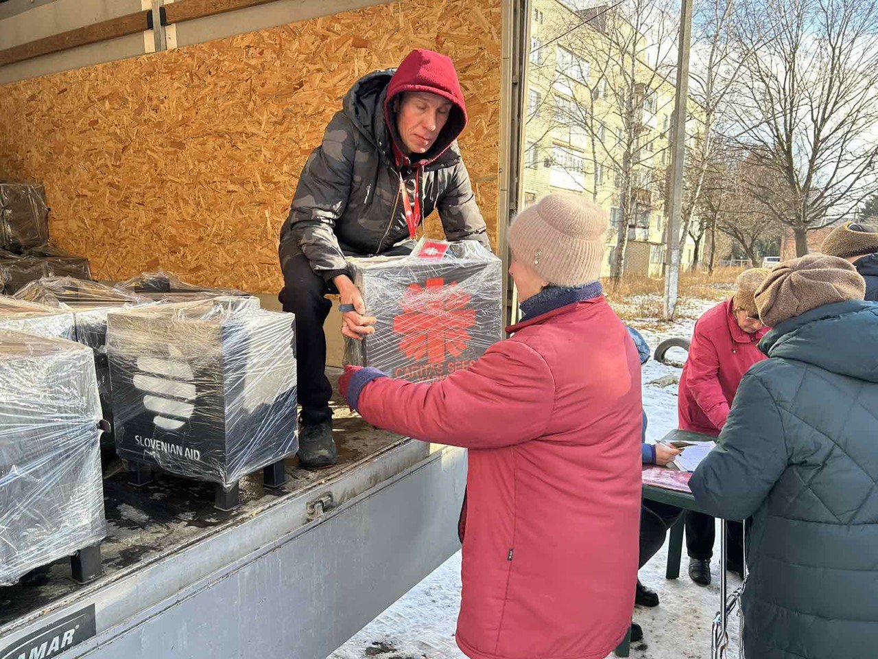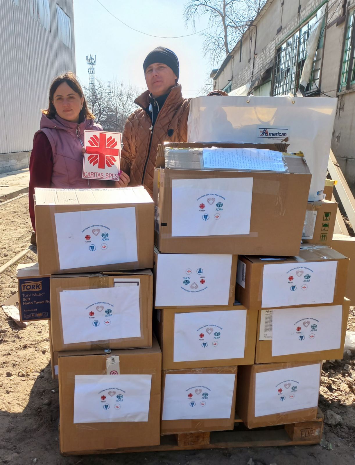 V času od 5. marca 2022 do 16. februarja 2023 je Slovenska karitas v sodelovanju s Karitas SPES Ukrajina v Ukrajino odposlala 29 humanitarnih pošiljk s 416 tonami oziroma 950 paletami materialne humanitarne pomoči. V pošiljkah je bilo največ pomoči v hrani, vodi, higienskem ter sanitetnem materialu, zdravila in medicinske aparature. Pošiljke so vsebovale tudi spalne vreče in armaflekse, novi čevlji, peči za ogrevanje idr. Finančno in materialno pomoč so darovali številni posamezniki in tudi 235 slovenskih podjetij. Med njimi je bilo tudi podjetje Krka d.d. iz Novega mesta, ki jedarovala zdravila v vrednosti 200.000 EUR ter SBC – Klub Slovenskih podjetnikov, ki so zagotovili pomoč za razseljene otroke v centrih Karitas znotraj Ukrajine v vrednosti 60.260 EUR in organizirali 2 pošiljki v Ukrajino. Materialna pomoč za te pošiljke se je zbiralatudi na ravni škofijskih in župnijskih Karitas, šol, univerz in drugih ustanov ter v trgovinah Mercator po vsej Sloveniji. Pri nakupu in posredovanju sanitetnega in medicinskega materiala v Ukrajino smo sodelovali tudi z Zdravniško zbornico Slovenije, Državljani sveta, Adro Slovenije ter s Slovenskim nefrološkim društvom. Karitas Spes v Ukrajini, sodeluje z okoli 10 bolnicami in so jim na podlagi potreb razdeljevale poslani sanitetni in medicinski material in aparature. Nekaj materialne pomoči se je na podlagi potreb v Ukrajini kupilo tudi z zbranimi sredstvi, še posebej preko posameznih projektov večjih donatorjev. Caritas Spes Ukrajina, ki je prejela teh 29 pošiljk je pomoč razdeljevala številnim družinam, posameznikom in bolnicam v ogroženih krajih in območjih kot so Kramatorsk, Rubizhne, Zaporožje, Volnovaka, Mariupol, Harkov, Dnipro, Kijev, Žitomir, Odesa, Ivano-Frankiv, Harson in druge. Misijonsko središče Slovenije pa je preko Slovenske karitas priskočilo na pomoč Caritas Spes v Ukrajini iz programa MIVA in kupilo dva kombija v vrednosti 46.000 EUR za evakuacijo ljudi na varna območja in dostavo pomoči na ogrožena območja.